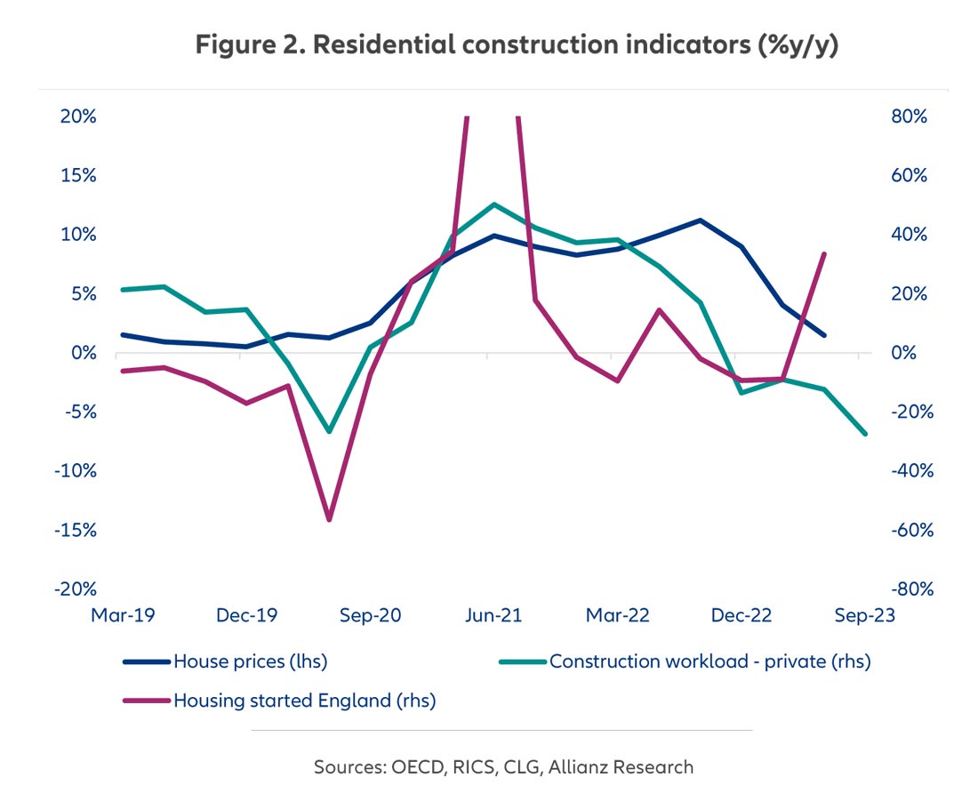 As interest rates have been rising fast in the UK, mortgagers have been on a downward trend and house prices have decelerated sharply. House prices only grew by 1%y/y in Q2 2023 while they grew by about 9% in 2021-2022. Housing starts in England have increased strongly (+33% as of Q2 2023), however construction firms have been reporting decreasing workload from private clients which points out that firms are clearing their backlogs and that the slowdown in new build is yet to come.