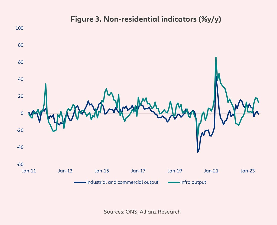Growth of non-residential construction in the UK has been on a downward trend since Q3 2022. Industrial and commercial output declined by about -1% as of August 2023 while infrastructure output grew by about +13%. Economic uncertainty, rising rates and the legacy of Brexit are probably the main factors driving slow non-residential build. Going forward, both segments segment should slowdown.