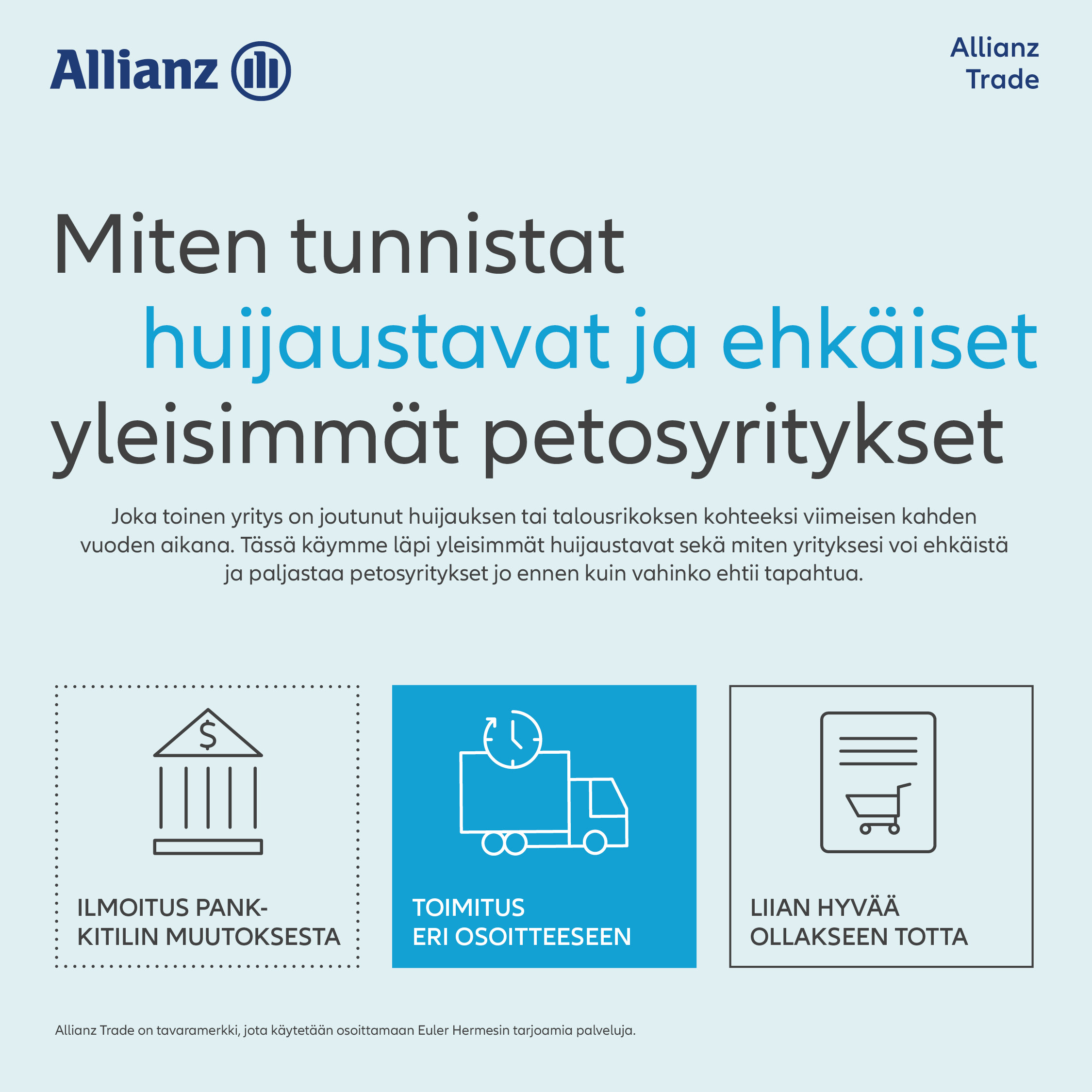 Esimerkki rahoitusalalta: ”Allianz Trade tekee paljon yhteistyötä pankkien ja rahoitusyhtiöiden kanssa. Me vakuutamme pankkien/rahoitusyhtiöiden ostamia laskusaatavia. Saatavien myynti ja rahoittaminen on hyvin yleistä ja ehkä juuri siksi myös rikollisten huomion kohteena. Volyymit ovat suuria ja summat isoja.”
