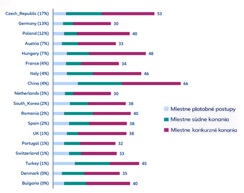 Pre slovenských exportérov je dôležité vnímať rozdiely v krajinách, s ktorými obchodujú najčastejšie. Náš hlavný exportný partner – Česko – dosiahol o niečo lepšiu hodnotu zložitosti vymáhania pohľadávok 53, ale rovnako ako nás ho skóre radí do úrovne „veľmi vysoká“. Naopak Nemecko (30) a Rakúsko (33) patria medzi 5 krajín, kde sa pohľadávky vymáhajú najjednoduchšie. Poľsko (40) a Maďarsko (48) vykazujú vyššiu zložitosť v dôsledku zdĺhavých súdnych postupov a komplikovaným konkurzným konaniam.