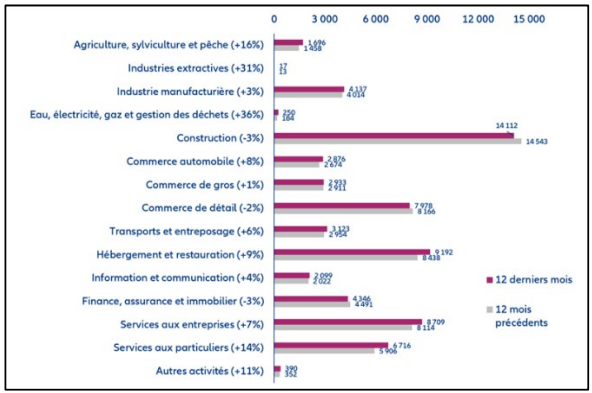 - Sur les 12 derniers mois, la dynamique haussière demeure marquée pour les secteurs tirés par la consommation des ménages : l’agriculture (+16 %), les services aux particuliers (+14 %), l’hébergement-restauration (+9 %) et le commerce automobile (+8 %).