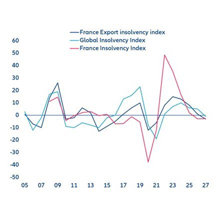 De plus, les perspectives économiques conduisent Allianz Trade à maintenir ses prévisions à l’échelle mondiale en matière de défaillances d’entreprises, avec une hausse attendue de +6 % en 2025 et une autre de +5 % en 2026. Cette évolution des faillites à l’international pose un double risque pour les entreprises françaises : celui d’une rupture ou d’une perturbation des chaines d’approvisionnement (pour celles qui se fournissent à l’étranger), et celui d’impayés (pour celles qui ont leurs principaux partenaires commerciaux à l’étranger), augmentant l’effet domino des défaillances.