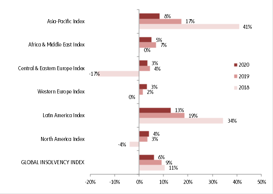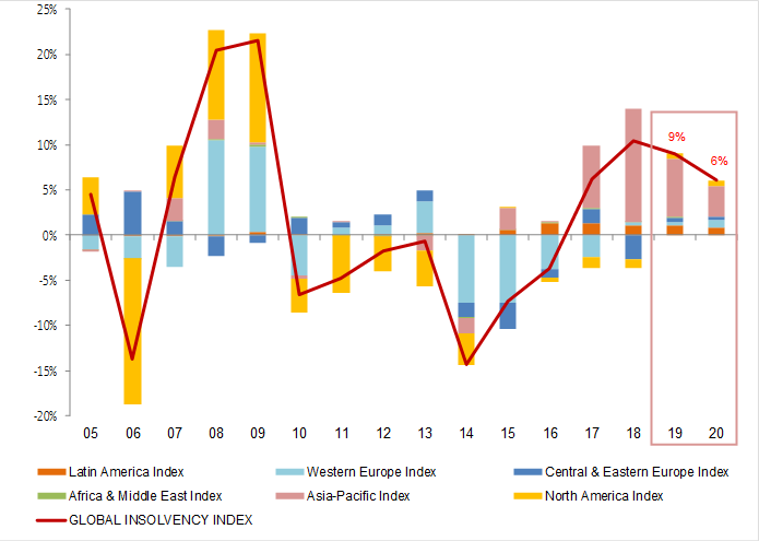 Global business insolvencies are set to increase by +6% in 2020